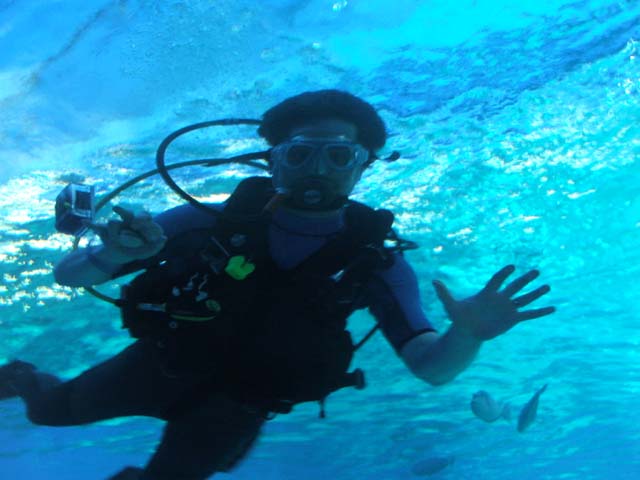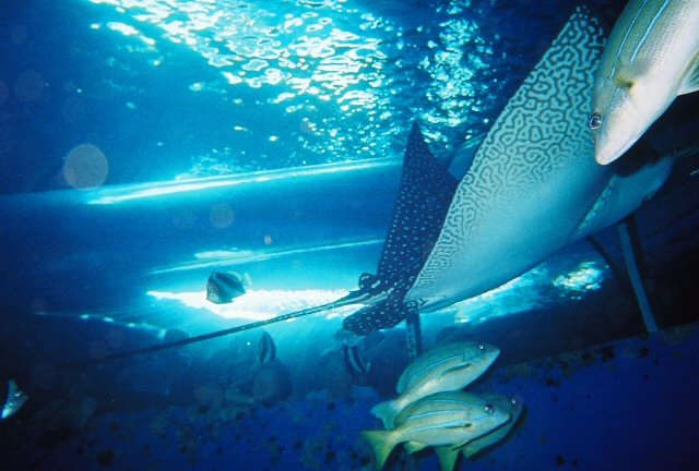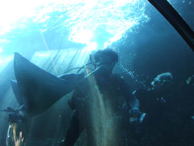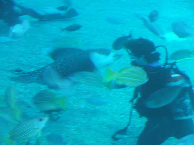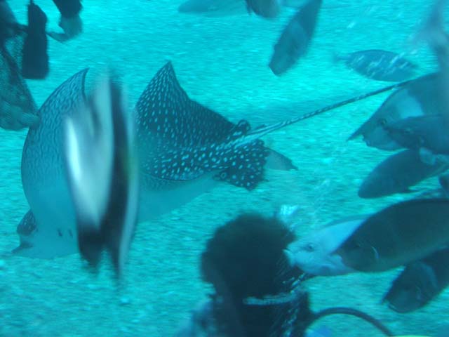 This spotted Eagle Ray is very friendly. She will come and take clams out of your hand to eat.